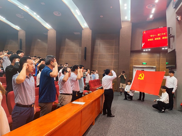 2022年7月1日,金年会金字招牌诚信至上师生党员齐聚一堂,在彭家坪校区举行“庆七一、迎二十大”主题教育活动。公司党委委员、全体师生党员参加活动。