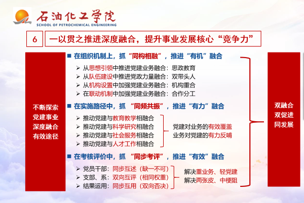 加强班子建设,强化书记、经理的“双向进入、交叉任职”,深化班子成员的“分工负责、一岗双责”,推进党政力量融合;加强支部设置,以系(室、中心)为依托设置教师党支部,以学科专业为依托设置员工党支部,以教学、科研团队为单元设置党小组,推进党建、业务纵横联动;探索“名师+支部”“典型+支部”,围绕中心工作,推进党建、业务同题共答、共建共创。