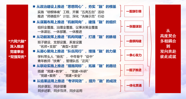 在“管大局”中深度融合,创新党的组织体系、制度体系和工作机制,实现组织功能延伸和业务发展全覆盖;在“做决策”中深度融合,深化政治、行政、学术、监督权力“四位一体”的治理体系建设,实现“三重一大”事项党委会会议先行把关、前置研究全覆盖,党政联席会议集体研究、民主决策全覆盖;在“保落实”中深入融合,深入推进党建与各项工作同谋划、同部署、同落实、同考核,一体贯通、首尾相继。