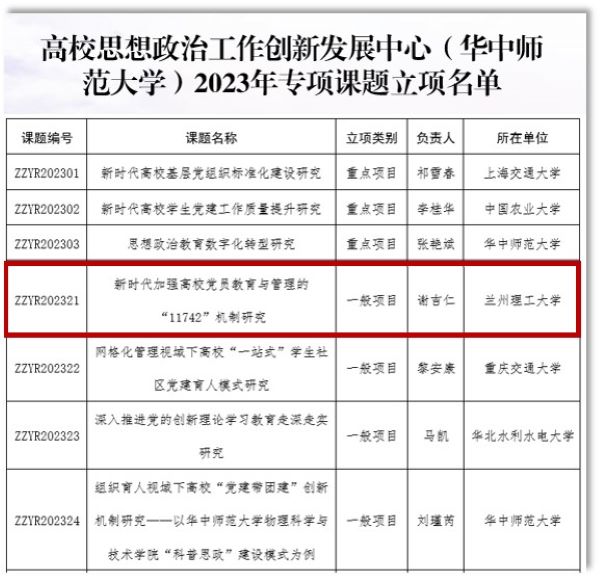 2023年12月13日,高校思想政治工作创新发展中心(华中师范大学)公布了2023年专项课题立项名单。公司党委谢吉仁、任鹏等申报的《新时代加强高公司党员教育与管理的“11742”机制研究》作为一般课题获得立项。