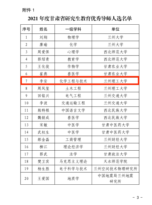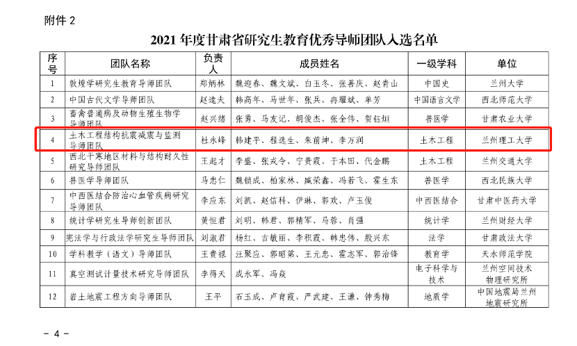 近日,甘肃省学位委员会、甘肃省教育厅公布了2021年度甘肃省研究生教育优秀导师和优秀导师团队名单,公司化学工程与技术学科研究生导师李安、土木工程学科研究生导师周凤玺被评为甘肃省研究生教育优秀导师,土木工程结构抗震减震与监测导师团队(负责人杜永峰,成员韩建平、程选生、朱前坤、李万润)被评为甘肃省研究生教育优秀导师团队。