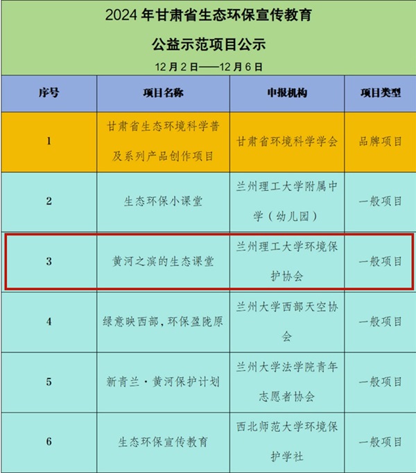 近日,甘肃省生态环境厅公示了2024年甘肃省生态环保宣传教育公益示范项目名单,金年会官方网站入口环境保护协会“黄河之滨的生态课堂”项目成功入选。