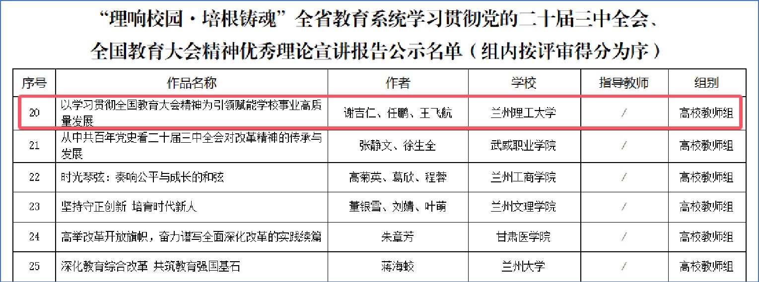 近日,由省委教育工委举办的“理响校园·培根铸魂”全省教育系统学习贯彻党的二十届三中全会、全国教育大会精神宣讲作品征集活动获奖名单揭晓,石油化工学院谢吉仁、任鹏等老师的作品《以学习贯彻全国教育大会精神为引领赋能公司事业高质量发展》获高校教师组优秀宣讲报告奖。