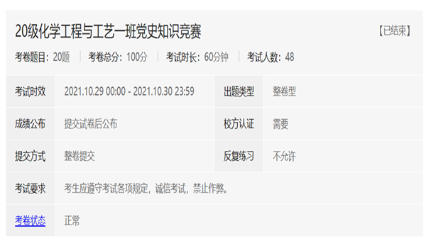 为庆祝中国共产党成立100周年,引导支部同学更好地学习党史知识,做到学史明理、学史增信、学史崇德、学史力行,2021年10月29日,20级化学工程与工艺1班团支部借助易班平台开展了党史知识竞赛。