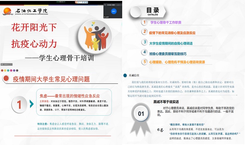 本次培训结合当前疫情封校期间易发的心理问题,引导员工心理骨干明确自身职责与角色定位,掌握必要的心理健康知识及助人技能,培育一支合格的朋辈辅导员工骨干队伍,努力形成全方位、多角度、全覆盖的心理健康教育合力。