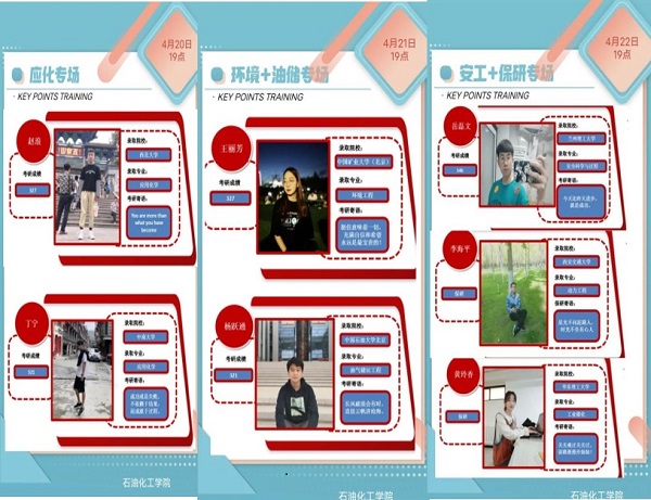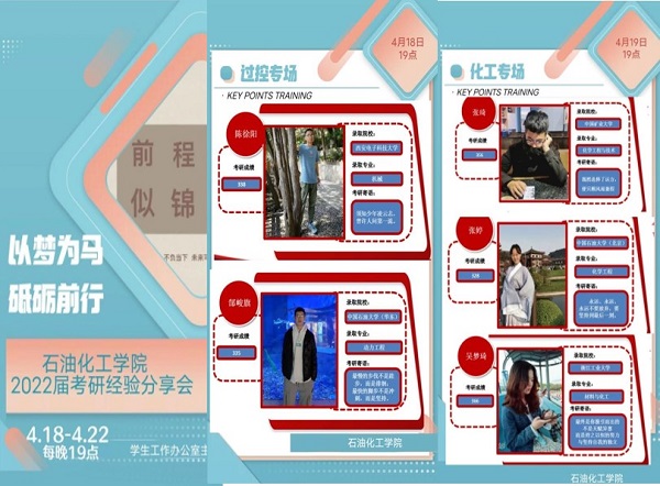 分享会面向公司全体本科生,分为“过控”、“化工”、“应化”、“环境+油储”以及“安工+保研”五个专场。分享会分别邀请到各专业12名考研成功2022届毕业生开展经验分享。分享人结合自己考研经历,从院校选择、时间规划、注意事项、备考方法、心态调整等方面为同学们讲述了宝贵的经验。