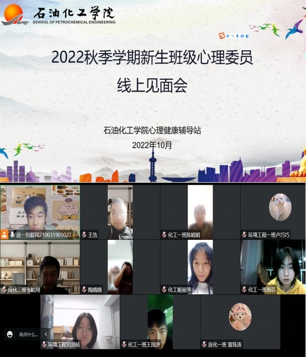 营造良好环境、共助心理健康。10月9日,在世界精神卫生日来临之际,金年会金字招牌诚信至上心理健康辅导站组织召开了2022级新生各班级心理委员线上见面会。心理辅导站指导老师朱建芳、辅导站员工骨干及2022级各班心理委员参加了会议。