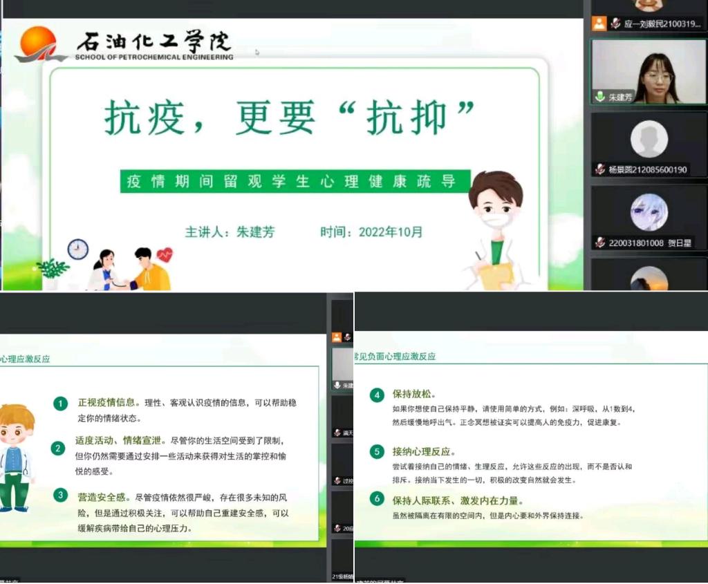 为全面了解掌握疫情防控期间隔离留观员工的学习、生活及情绪、心理状况,引导员工塑造积极心态,2022年10月14日,公司开展线上留观员工心理疏导,心理健康辅导站指导老师朱建芳主讲,公司全体留观同学参加。