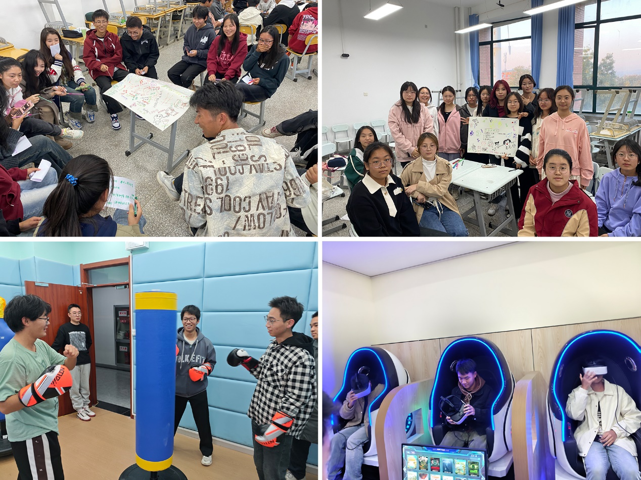 活动共分为导入、实施、巩固三个阶段,导入阶段通过“大风吹”等热身活动,初步建立安全、信任的氛围;实施阶段通过“订立团体契约”帮助成员了解及时沟通的重要性和团队协作的重要意义;巩固终结阶段通过“大学中的酸甜苦辣”环节帮助员工梳理大学中常见的挑战,共同讨论应对措施和解决办法。在心理中心体验日活动中,心理委员、宿舍心理联络员参观了沙盘放松室、团体辅导室、心理咨询室和音乐治疗室,参与了小组心理沙盘活动,体验了智能击打呐喊设备、VR智能身心反馈训练系统。同学们纷纷表示今后将做好心理健康知识普及宣传,积极关注身边同学的心理健康状况,充分发挥朋辈心理引导员作用。(撰稿:朱柯宇;终审:任鹏)