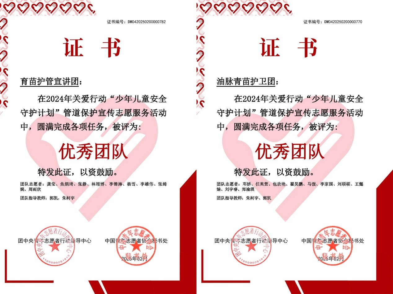 近日,团中央青年志愿者行动指导中心和中国青年志愿者协会秘书处联合公布了2024年全国老员工关爱行动“少年儿童安全守护计划”管道保护宣传志愿服务项目优秀团队名单,金年会jinnian的“油脉青苗护卫团”与“育苗护管宣讲团”在全国1000支团队中脱颖而出,荣获2024年全国老员工志愿宣讲项目“优秀团队”荣誉称号,全国仅100支团队获得的该项荣誉。