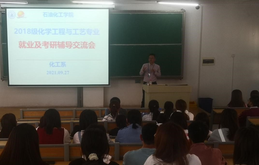 7月28日,金年会金字招牌诚信至上化工系召开就业指导暨考研辅导交流会,化工系主任张建强教授,博士生导师李安教授,辅导员李玉鹏,博士李宁、董鹏及2018级化学工程与工艺专业全体本科生参加会议。