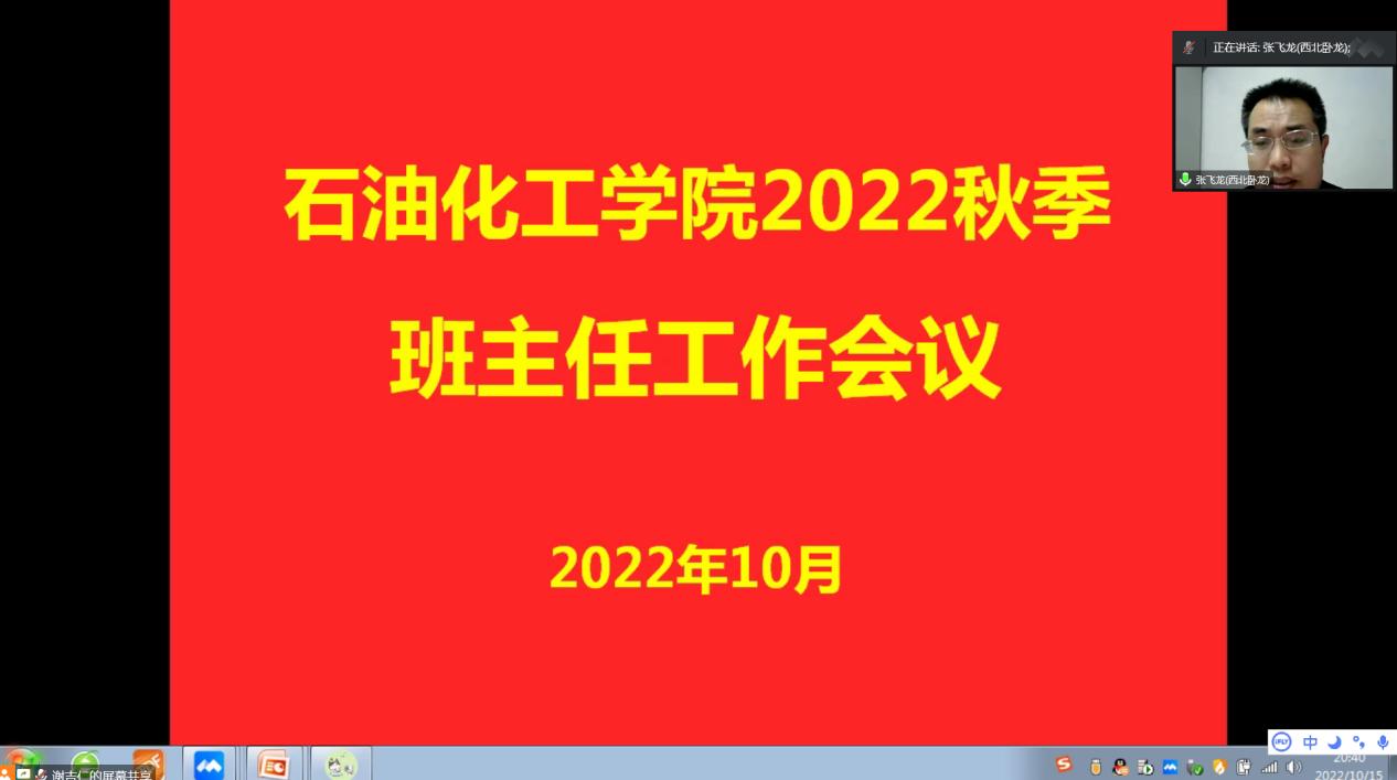 2022年10月15日晚,公司召开2020秋季班主任工作会议,公司党委副书记张飞龙,全体辅导员、班主任老师参加了会议。
