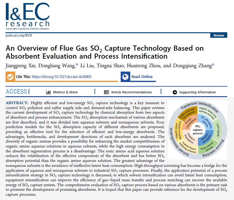 近日,金年会金字招牌诚信至上科研团队——甘肃省绿色催化与过程工程团队在国际化工顶级期刊《Industrial & Engineering Chemistry Research》发表题为“An Overview of Flue Gas SO2 Capture Technology Based on Absorbent Evaluation and Process Intensification”(https://doi.org/10.1021/acs.iecr.4c00405)的综述文章。这是公司作为第一作者单位首次在国际化工顶级期刊发表研究论文,标志着在化学工程领域的研究迈上新台阶,对推动化工团队建设具有重要支撑作用。