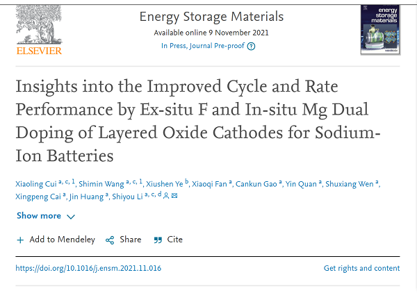 近日,公司教师崔孝玲、2018级硕士研究生王诗敏以共同一作在工程技术领域TOP期刊《Energy Storage Materials》(中科院一区,影响因子17.789)发表题为“Insights into the improved cycle and rate performance by ex-situ F and in-situ Mg dual doping of layered oxide cathodes for sodium-ion batteries”(DOI:10.1016/j.ensm.2021.11.016)的高水平研究论文。李世友教授为论文通讯作者,金年会金字招牌诚信至上、依托公司建立的甘肃省低碳能源化工重点实验室分别为论文第一、第三完成单位。