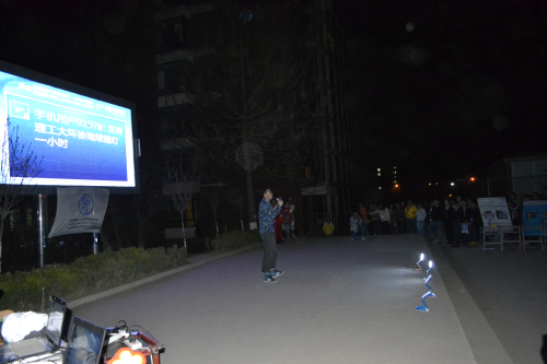活动当晚,北村共有400多间宿舍参与了熄灯一小时活动,环保协会为同学们奉上了精彩的环保时装秀、环保魔术、环保歌曲及环保话剧等节目。与此同时,通过微博墙以“甘肃熄灯一小时”为话题,现场的同学都积极参与讨论与互动。最后,本次活动在2013年“地球一小时”活动的主题曲中结束。