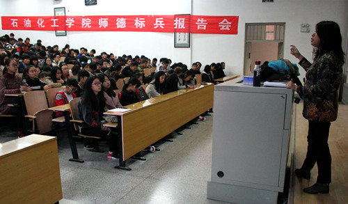 徐惠教授的报告用朴实而真挚的语言,结合自身的从教经历,从不同时期、不同角度、不同层面生动地阐述了对教书育人的执着,对教育事业的热爱和忠诚。鲜活感动的事迹、发自肺腑的精彩演讲,诠释了新时代师德的深刻内涵。他从自身二十多年的从教经验总结出:机会属于有所准备的人,成功属于勤奋努力的人。她说,“一支粉笔,千钧重担,教书育人谱新篇;三尺讲台,四季晴雨,爱岗敬业立新功”,教师要时刻牢记教书育人的使命,愿以“用心谋事,用功做事”与大家共勉;同时,徐惠教授还对在场聆听报告的同学们提出了几点希望,一是希望同学们要对四年老员工活制定明确目标和合理规划,并努力完成;二是希望同学们要摒弃“60分”万岁的老旧观念,努力提高各门功课的成绩,提高自身竞争力;三是希望在注重文化课的同时也要关注自己的身体健康,多参加体育锻炼,培养良好的兴趣爱好。