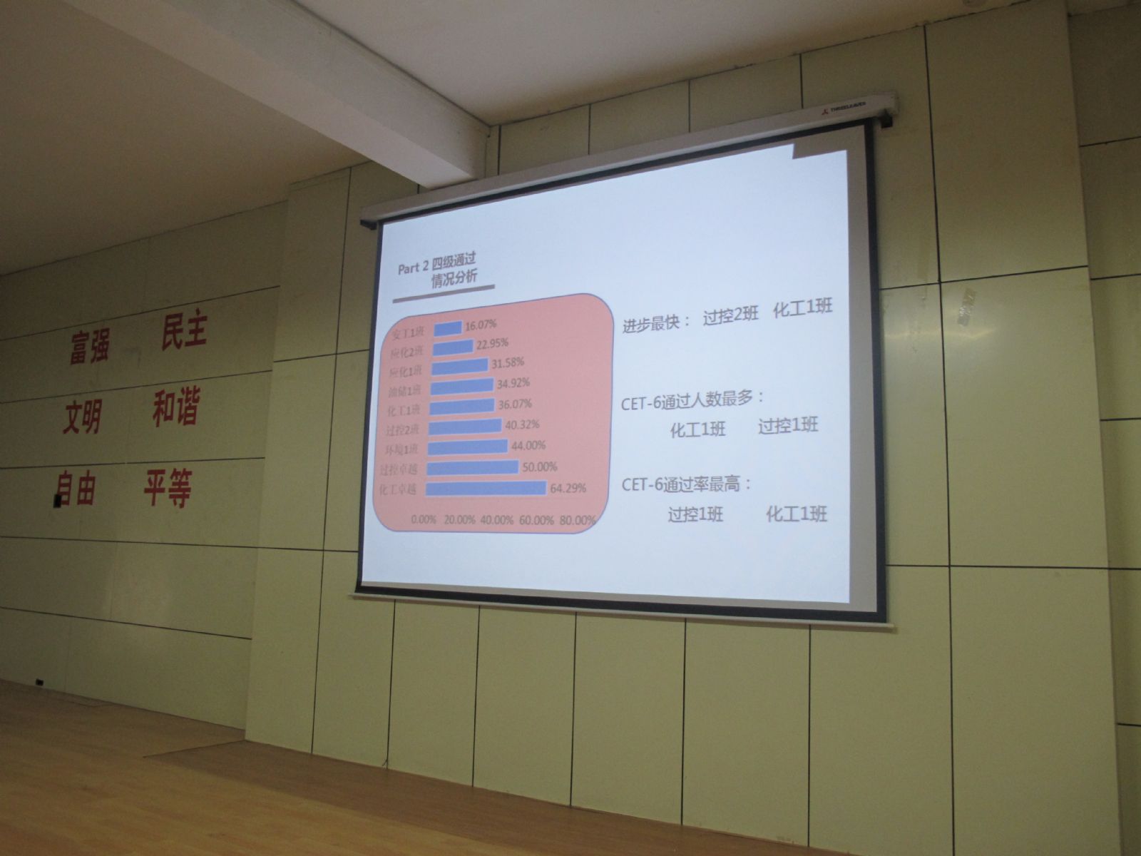 大会最后,荣获上一学年校级“优秀班集体”的工艺卓越班和环境1班的班干部向同学们分享了他们各自班级的四六级备考经验及学风建设情况,有优势有不足,为同学们的学习起到了指导作用。