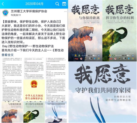 此次活动主要通过易班和环保协会QQ空间推送联动进行,从4月6日开始,科普共进行九期,依次介绍野生动物中病毒携带者以及病毒中间宿主之间的关系、《中华人民共和国野生动物保护法》中大众忽视的细节、3月3日“世界野生动植物日”的设立由来以及2013年至今以来的活动主题等内容,目前已推送两期,通过科普我们了解到很多关于野生动物的知识,比如法律所保护的野生动物,是指珍贵、濒危的陆生、水生野生动物和有重要生态、科学、社会价值的陆生野生动物。