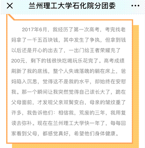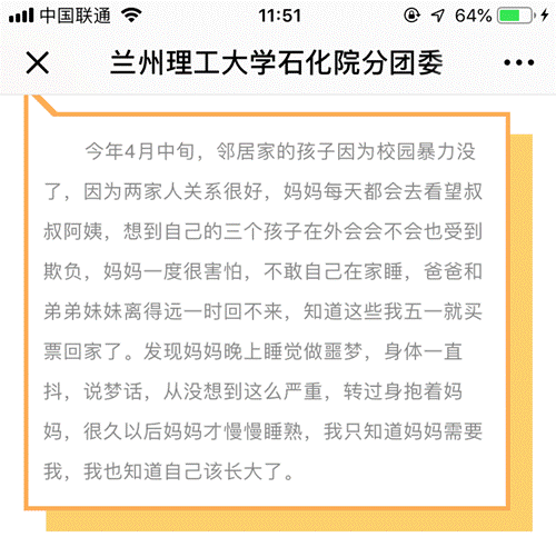 本次活动中,各年级同学踊跃参与,后台共收到主题留言100余条,内容涉及亲情、责任、理解等多个方面。同学们通过回忆成长经历中印象深刻、影响深远的一个瞬间或一件小事,有感有悟,再次认识自我,体会收获。公司团委整理筛选后通过微信平台不记名推送展示,引导全院同学在他人的故事里品味自己的成长体验,在对照自我的同时重新规划自我,推送内容阅读量超过400人次。
