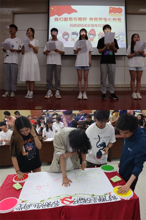 活动现场,范梦琦等六位同学为大家带来了朗诵《民族团结之歌》,这是各民族心与心的桥梁,是通往和谐的一首赞歌。同时高沙尔、麦合丽娅等七位少数民族同学专门为今天的活动录制了视频,介绍自己的民族,介绍自己的家乡,再一次拉近了彼此之间的距离。现场还展列了由各民族同学提供显示家乡变化的照片,大家纷纷表示在中国共产党的正确领导下,我国少数民族的面貌、民族地区的面貌、民族关系的面貌、中华民族的面貌都发生了翻天覆地的历史性巨变。活动的最后,各民族同学上台一同在海报纸上摁上了自己的手印,喻示着各民族手拉手,心连心,中华民族一家亲,同心共筑中国梦。