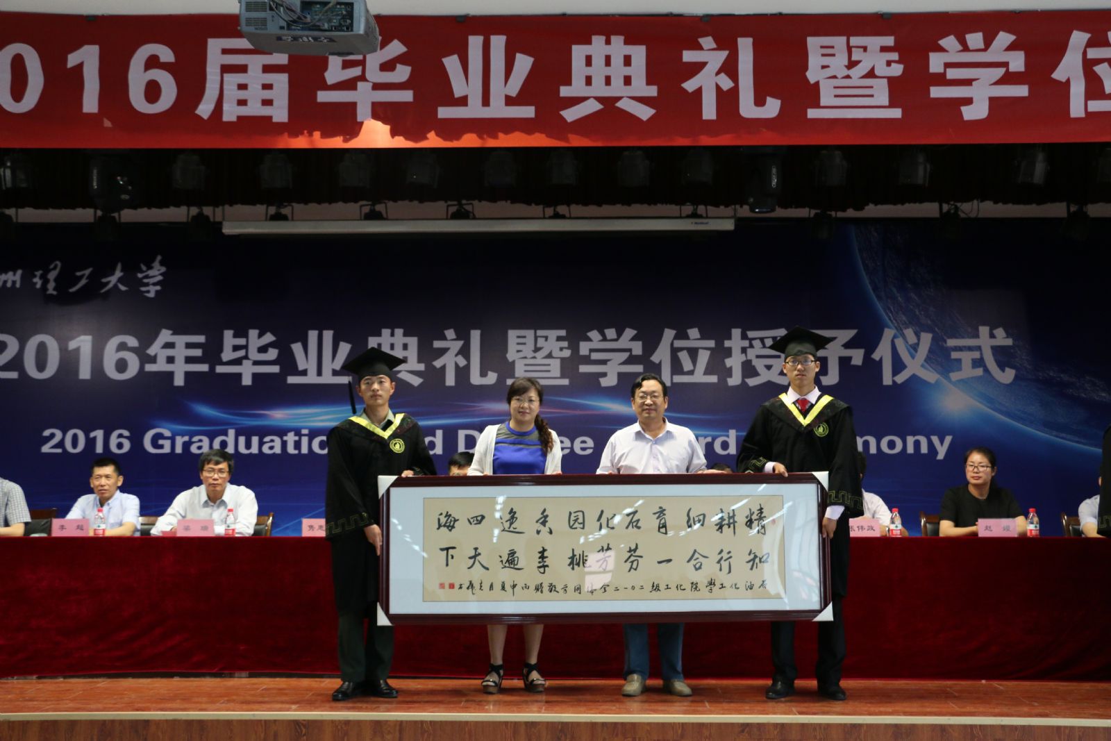 今天,你们即将走上社会,大学毕业只是走向社会的第一步。在艰苦漫长的事业追求和为梦想拼搏的人生征途中,你们还要经历更加精彩而丰富、艰难而困苦的阶段,等待你们的,会有高峰,也会有低谷;会平坦顺利,也会波折起伏;会获得成功,也会遭遇失败。人就是在磨砺碰撞中成长、成熟,事业也是在压力挫折中获得成就和成功的。杨经理最后寄同学们,“四年工大情,格物致知,鲲鹏展翅欲高飞;廿载石化梦,修德弘业,蛟龙昂首将入海。希望同学们在人生旅途中,居处恭、执事敬、育人忠,祝愿同学们诚以做人、明以做事、梦想成真。”