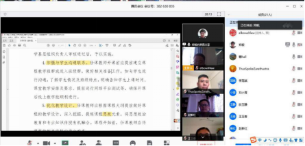 其次,传达了公司2020年春季学期第四次本科教学工作例会的精神。对教学基层组织督导、2021版培养方案修订、创新创业教育、线上教学工作规范、毕业设计(论文)指导、实验与上机教学安排等近期本科教学工作进行了安排,强调了公司关于线上线下教学工作的两个转变和两个做实做细工作要求。严格要求各基层组织传达会议精神,组织每位老师共同学习《金年会官方网站入口本科线上教学工作规范(试行)》,并在后续的线上教学工作中严格执行工作规范。