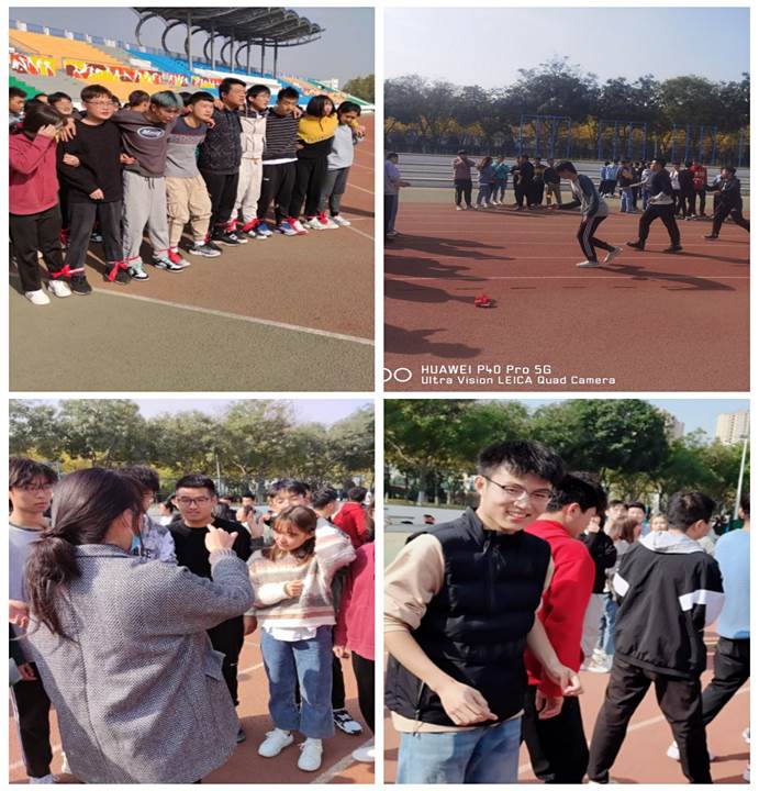 本次趣味运动比赛共五个环节,第一环节是绑腿比赛,绑腿活动要求同学们步伐一致、动作协调,对班委的默契度和配合度有着很大的考验;第二环节是乒乓球接力赛,接力赛的核心在于考验同学们工作分配、工作衔接的能力;第三环节是你画我猜比赛,在此比赛中,要求班委有着很好的肢体表达能力与肢体沟通能力;第四环节是拔河比赛,比赛过程中,各班团干部团结一致,共同出力,积极参加拔河比赛;最后是互动环节,同学们坐在操场上,面部洋溢着欢快的笑容,共同分享着活动心得。