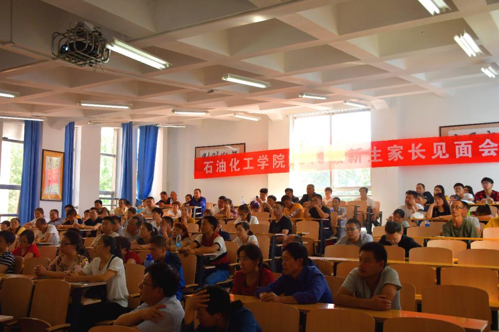 8月29日下午3点,石化公司在彭家坪校区集贤楼304教室召开2019级新生家长见面会,公司经理李贵贤、党委书记滕怀荣、副经理张伟政、副经理梁卫东、党委副书记李荣华、2019级辅导员及班主任与150余名新生家长参加会议。会议由公司党委副书记李荣华主持。
