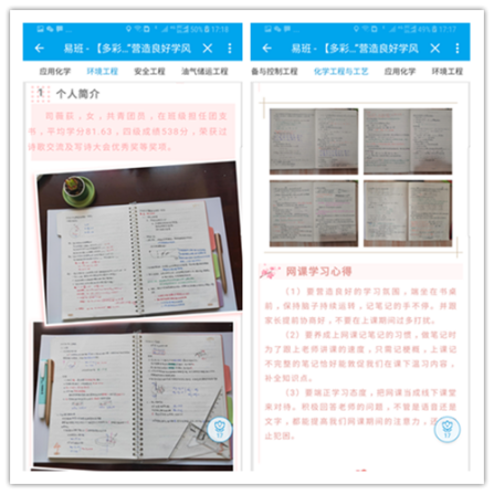 晒云端课堂笔记、谈网课学习经验。4月4日-4月14日公司利用易班平台开展“网课‘易’起学”,活动,将疫情期间大一至大三年级六个专业的重点课程学习笔记以易班轻应用的方式展示给全体同学,同学们在云端课堂依然保持着良好的学习习惯,坚持做好课堂手写学习笔记。这些笔记字迹工整,条理清晰,形式多样,令人称赞。不仅点出课程重点内容,并且将网课的学习的方法、课程收获以及学习心得加以展示,以榜样的力量激励同学们网课期间仍然要自律自强,坚持上好每一节课。2019级过控专业的张金枝同学跟同学们分享到:“人们戏称这个春天是属于老师的,他们都是网红主播,隔着电脑屏幕听到老师的声音似乎更加亲切,课堂发弹幕回答问题似乎更加有趣,但网络课堂更多的是给了我们一个反思的机会,让我们认识到平常学习的不足,等再次开学能够回到公司学习的时候,我们一定加倍的努力!”。