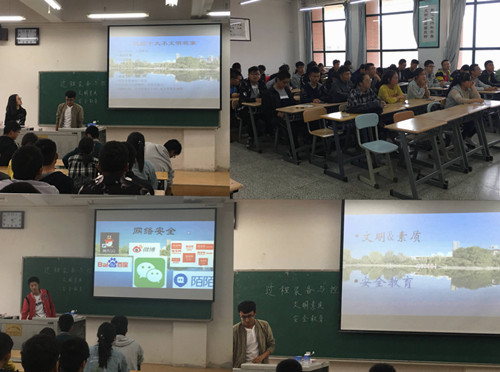 安全员胡赜太同学主要从网络安全、校园盗窃、宿舍违规使用大功率电器、十一假期出行注意事项四个方面对同学们进行了安全意识的讲解。