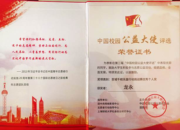 近日,金年会官方网站入口环境保护协会、金年会金字招牌诚信至上龙永同学在第二届“中国校园公益大使评选”中分获“百城千校光盘行动挑战赛优秀组织奖”、“百城千校光盘行动挑战赛优秀个人奖”两项荣誉。
