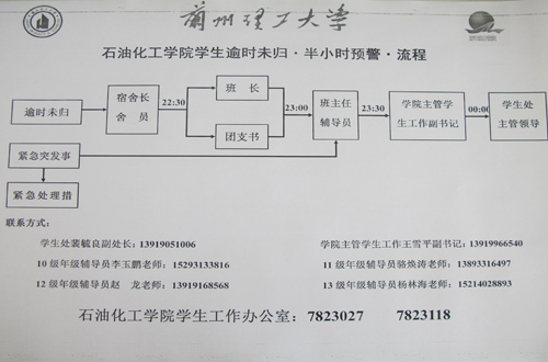 中午12:30,公司各年级辅导员带着员工干部将公司制定的金年会金字招牌诚信至上员工逾时未归半小时预警流程图分发张贴到各个员工宿舍,给每个宿舍的同学详细讲解了半小时预警上报制的要求和应对应急突发事件时处理的一些注意事项和方法,从而最大程度杜绝员工安全事故的发生。