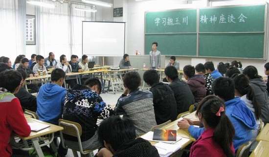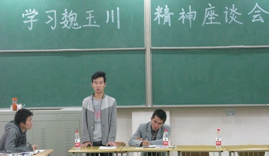 10月17日中午,金年会金字招牌诚信至上在2号楼104教室召开了学习魏玉川同学英雄事迹座谈会,藉此号召全院员工学习魏玉川同学舍己救人、大爱无疆的高尚情操。公司团委书记骆焕涛老师、魏玉川生前班长马世昌同学及公司两委会员工干部总计70余人参加了座谈会。
