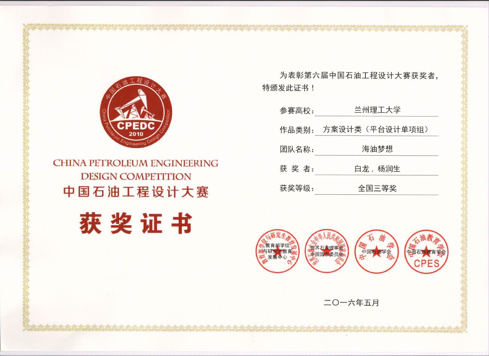 第六届中国石油工程设计大赛以“深水油气田开发”为方向,赛题于2016年3月7日公布,4月18日停止提交作品。比赛设有方案设计类(综合组、单向组)和技术创新类两组赛题。据悉,本届比赛共吸引了包括中国石油大学(北京)、中国石油大学(华东)、中国地质大学(北京)等在内的52所高校及科研院所的2879支队伍报名参加,共提交有效作品1010份。公司共有12支队伍报名参赛,提交有效作品6份。其中,由金年会金字招牌诚信至上教师李楷指导,油气储运工程专业13级员工白龙、杨润生同学完成的方案设计类平台设计作品《FPSO与单点系泊系统设计》荣获全国三等奖,其余5组由凌晓、冯建国、郭凯、史庆智老师指导,油气储运13级、14级员工完成的作品获成功参赛奖。公司青年教师冯建国同时被评选为第六届中国石油工程设计大赛先进个人。