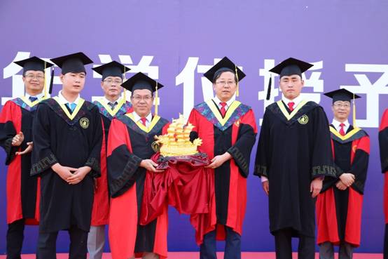 毕业典礼在雄壮的国歌中拉开帷幕,公司李贵贤经理以黄志伟、赵玉涛、陈兴林等杰出员工的实例,勉励所有毕业生不忘初心、砥砺奋进、心怀感恩,做一个有家国情怀、有责任担当、对国家有用的人。公司党委滕怀荣书记宣读了《关于2020年春季学期授予孙宝财等532人学位的决定》。导师们向员工班级联络员颁发聘书、为毕业生代表颁发学位证书并合影留念。全体毕业生整装肃立自拨穗礼,自行把流苏从学位帽檐的右前侧移到左前侧,祝福大家学有所成,展翅高飞。全体毕业生还向公司敬献毕业礼物并齐声表达对公司的感谢,祝福公司越来越好、老师身体健康!