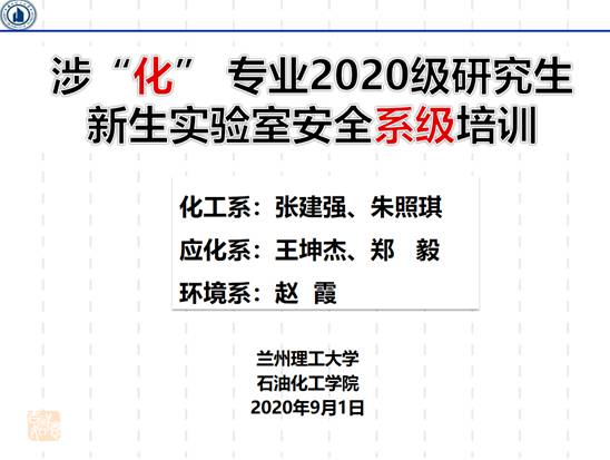 张建强教授代表化工系、应化系、环境系举行了“涉化专业2020级研究生新生系级安全培训“。培训报告从国内、省内高校实验室安全及管理的现状为大背景出发,围绕高校实验室功能、高校实验室安全、高校实验室安全文化、近年来高校实验室安全事故典型案例、高校实验室安全风险与防护、建设金年会官方网站入口实验室安全管理实践的“五个一工程”等六个大的方面,从实验风险评估、化学试剂尤其是危险化学品及管控试剂采购、管理和使用、仪器设备、安全防护、应急处置、危废处置以及常规的水电气等多个方面进行了详细的培训。本次培训进一步提高了2020级研究生新生的安全意识,增强了实验室安全知识,为新一届研究生将来安全、健康的进行实验研究工作奠定了基础,同时也进一步提高了导师队伍的安全管理水平。