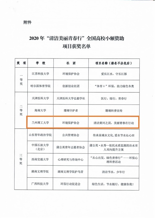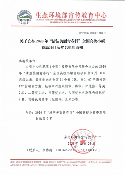 近日,生态环境部宣传教育中心2020年“清洁美丽青春行”项目获奖名单公布,公司环境保护协会荣获二等奖。