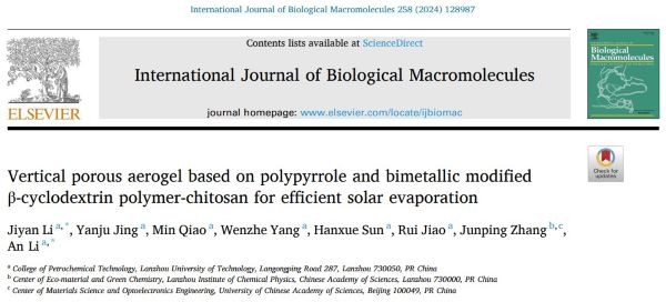 在International Journal of Biological Macromolecules(SCI 1区,IF= 8.2)发表的论文(2024, 258, 128987),制备了一种具有垂直排列孔道结构的环糊精/壳聚糖复合气凝胶(PPy-La/Al@CDP-CS),通过太阳能驱动界面蒸发技术进行含氟废水净化。在1 kW m-2辐照下,PPy-La/Al@CDP-CS的蒸发速率为1.85 kg m-2 h-1。PPy-La/Al@CDP-CS具有性能优异、成本低廉、环保等优点,为太阳能光热材料在水处理领域的应用提供了新的材料设计方法和应用途径。