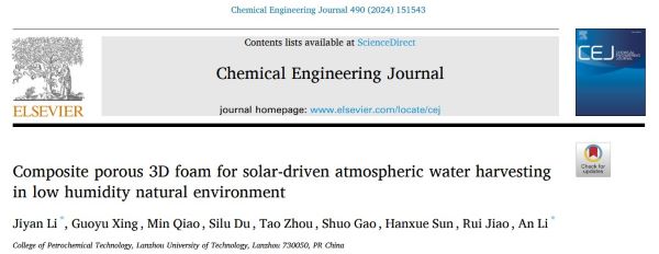 在Chemical Engineering Journal(SCI 1区,IF=15.1)上发表的论文(2024, 490, 151543),针对全球淡水资源危机问题,通过对太阳能驱动集水技术的研究,设计开发了一种高效的多孔聚合物泡沫(LiCl@CCP-PPy)用于大气集水。该材料制造成本低廉,适应性和便携性强,在腾格里沙漠的实验应用中达到了日产0.64L/m2的产水率,且水质符合国际饮用水标准,实现了低湿度环境下太阳能驱动的大气集水。