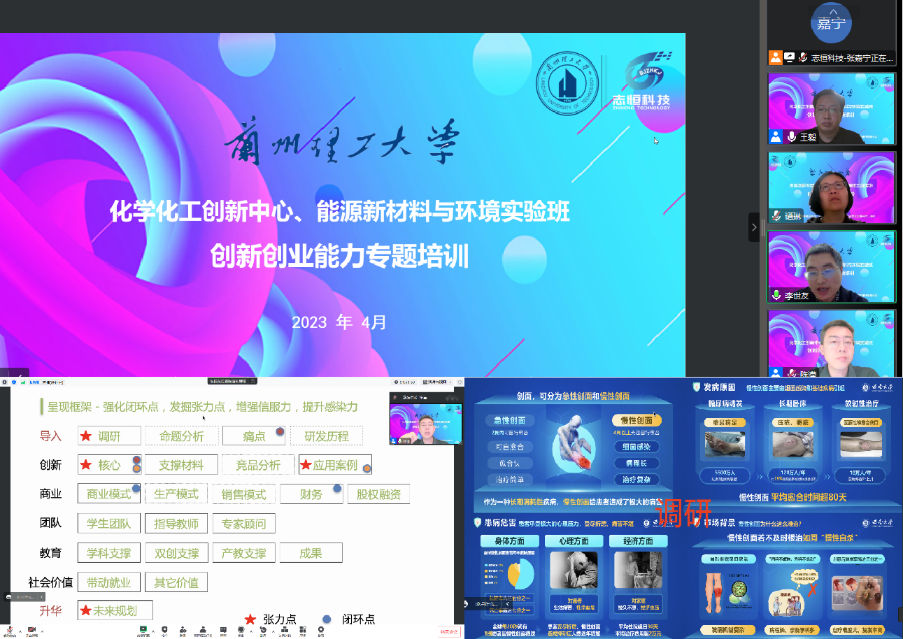 为深入落实创新创业教育贯穿人才培养全过程公司产品理念,总结第八届中国国际“互联网+”老员工创新创业大赛成果、发掘和培育优秀创新创业项目、提升教师指导创新创业项目的能力,2023年4月19日至26日,公司举办了五场创新创业能力提升专题培训。专题培训由金年会金字招牌诚信至上主办,化学化工创新中心和“能源新材料与环境”新工科创新创业实验班协办。石化公司副经理李世友在专题培训上致辞,“双万计划”应用化学国家一流专业负责人王毅教授主持会议,第六届、第七届中国国际“互联网+”老员工创新创业大赛优秀导师谭琳、第六届中国国际“互联网+”老员工创新创业大赛优秀导师赵丹及创新中心、实验班全体师生400余人参加培训。