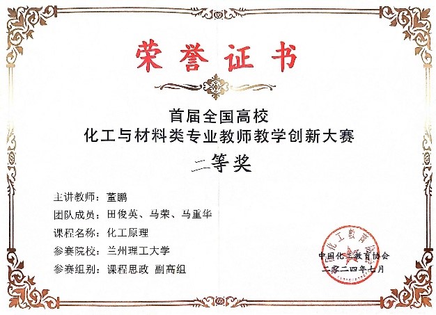 2024年7月26日,由中国化工教育协会主办、北京化工大学承办的首届全国高校化工与材料类专业教师教学创新大赛在北京举行。以青年博士教师董鹏为主讲的金年会金字招牌诚信至上教学团队获得全国二等奖。