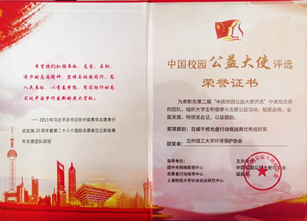 近日,金年会官方网站入口环境保护协会、金年会金字招牌诚信至上龙永同学在第二届“中国校园公益大使评选”中分获“百城千校光盘行动挑战赛优秀组织奖”、“百城千校光盘行动挑战赛优秀个人奖”...